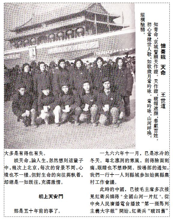 回忆当年,王世道一行十一人,是农场派出参加始兴县农村工作会议的。我们每个人都背着行理背包,还按要求带上锄头去参加会议及劳动。在县城公路行进时,不知是谁提出:到北京去,经风雨、见世面,接受毛主席的检阅。正合大伙心意,立即行动,拆去锄头柄,把锄头收到背包里。直奔韶关,坐特快列车上北京。