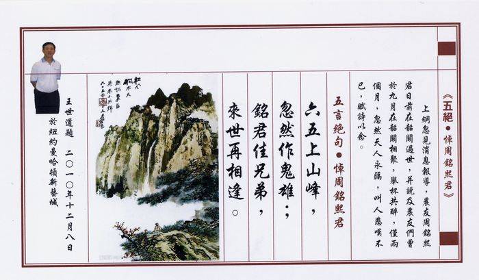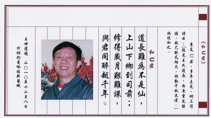 注:农友王世道在纽约的文艺界中是颇有名气的。他是(纽约文艺)的总编辑;纽约诗书画琴棋会顾问;纽约曼哈顿业余艺术团(有150多名成员)的团长兼执行总监;纽约诗词学会会员;全球艺术家联盟常务理事等。