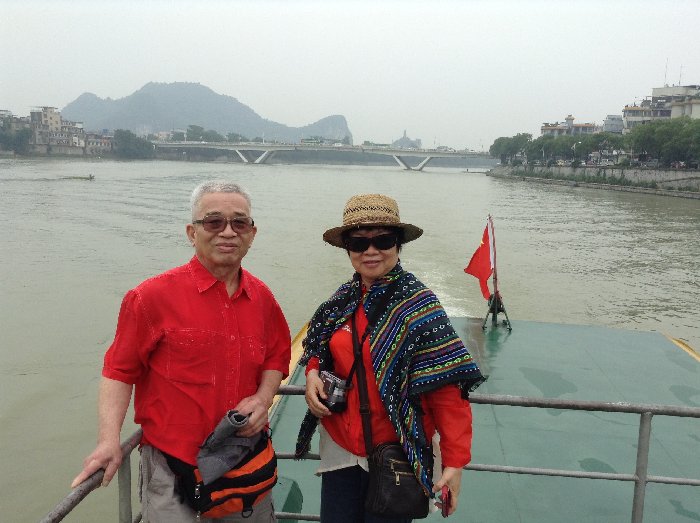 一套情侣装,同样红衣裳。双双游漓江,齐齐乐洋洋。